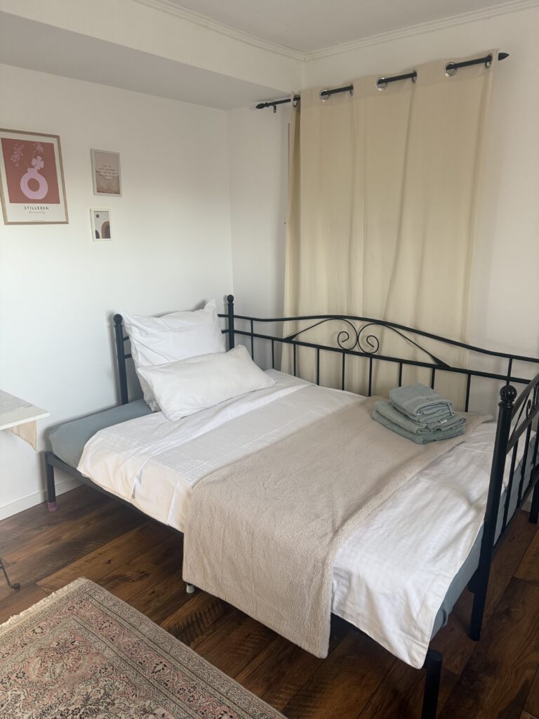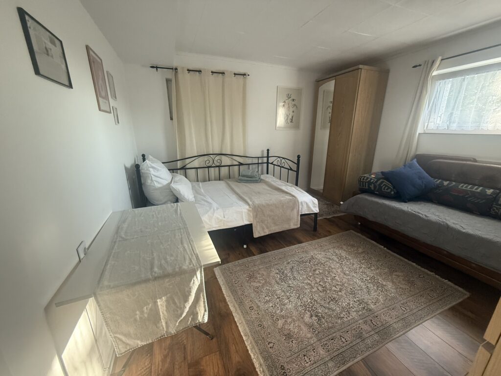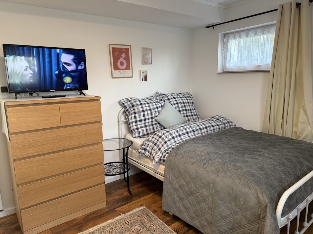 A1-1 is a private room within the garden-level flat. The kitchen and bathroom are shared only with the neighbouring room (A1-2). It offers direct access to the terrace with river views.